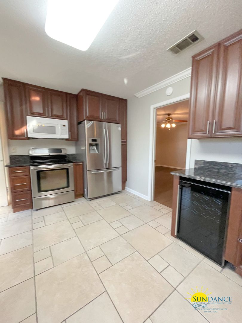 This beautifully updated 1-bedroom, 1.5-bath gem ideally located in Fort Walton Beach, just minutes from both military bases, top-rated shopping, dining, and entertainment. Step inside to find an inviting open-concept living and dining area, featuring modern tile and LVP flooring throughout. The kitchen boasts a breakfast bar, walk-in pantry, gas stove & oven, mounted microwave, refrigerator, and dishwasher, perfect for everyday convenience. The primary suite offers a walk-in closet and a private bath with a shower-only layout. Enjoy added functionality with washer & dryer hookups, ceiling fans, and an auto garage door opener. Outside, you’ll love the oversized screened back patio, ideal for relaxing or entertaining, plus a nice exterior storage workshop (as-is) for all your hobbies or tools. The home includes a 1-car garage, driveway parking, and landscaping services are included for easy maintenance. You do not want to miss the chance to call this magnificent unit home!