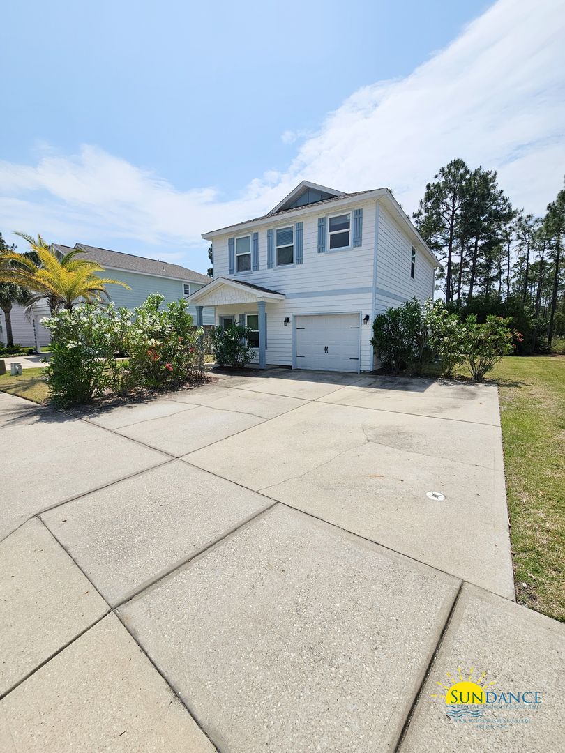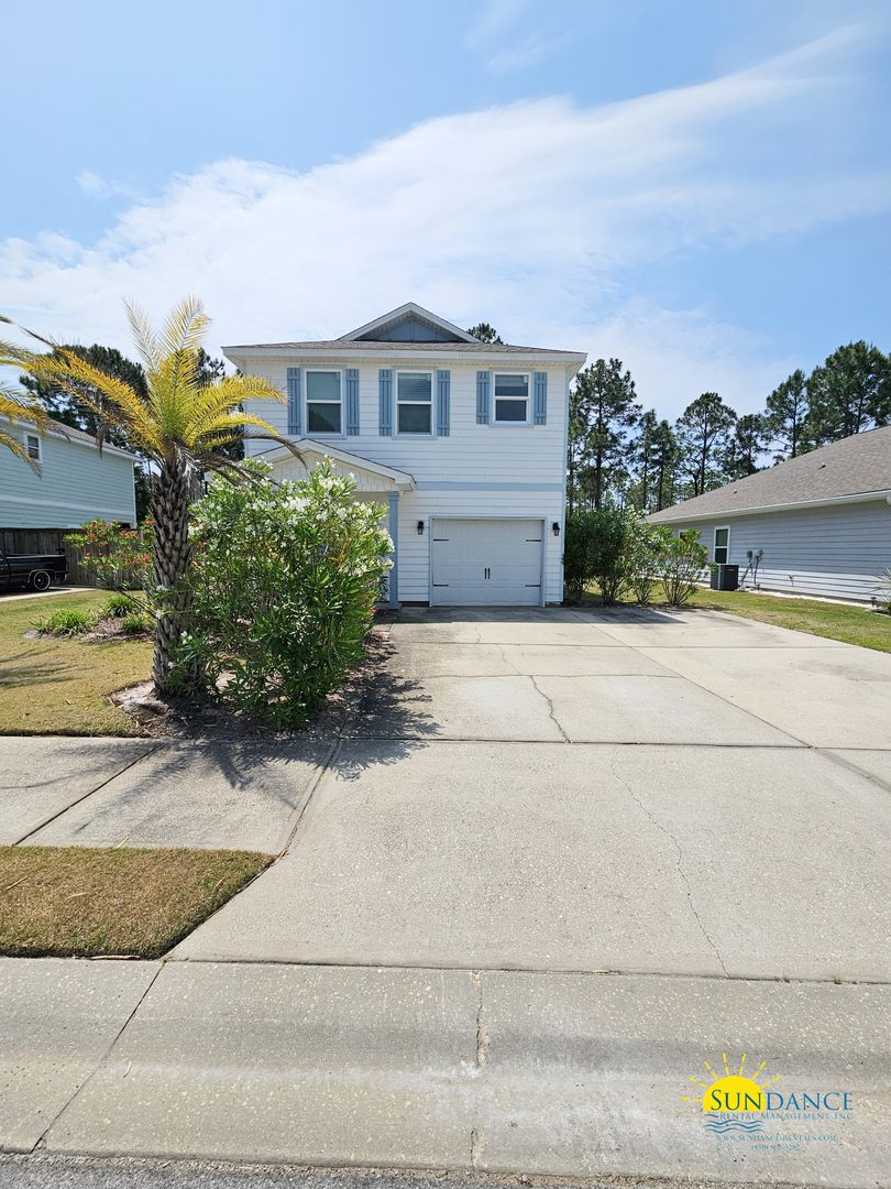 This charming two-story home is located in the Topsail Walk neighborhood in Santa Rosa Beach. It’s in a quiet cul-de-sac just north of Highway 98, offering comfort, style, and privacy. The home has 3 bedrooms, 2.5 bathrooms, offers a attached 1-car auto garage, and driveway parking—making it a great find. Inside, the home boasts a functional split-bedroom floor plan with recessed lighting and hardwood look vinyl flooring throughout all living areas while the bedrooms are comfortably carpeted and complemented by tile in key areas. The full kitchen is designed for both function and gathering with stainless steel appliances, an electric stove and oven, mounted microwave, garbage disposal, pantry, breakfast bar, and a refrigerator with ice and water. The primary suite offers a relaxing retreat with a walk-in closet, dual vanity, garden tub, and separate walk-in shower. Two additional generously sized bedrooms share a convenient Jack-and-Jill bathroom with split sinks. A dedicated laundry room with washer and dryer included adds everyday convenience. Outside, enjoy the peaceful natural surroundings from the open patio or backyard deck, with yard maintenance included for easy living. HOA guidelines to maintain community standards, this home is a wonderful opportunity to enjoy coastal living in a serene setting.