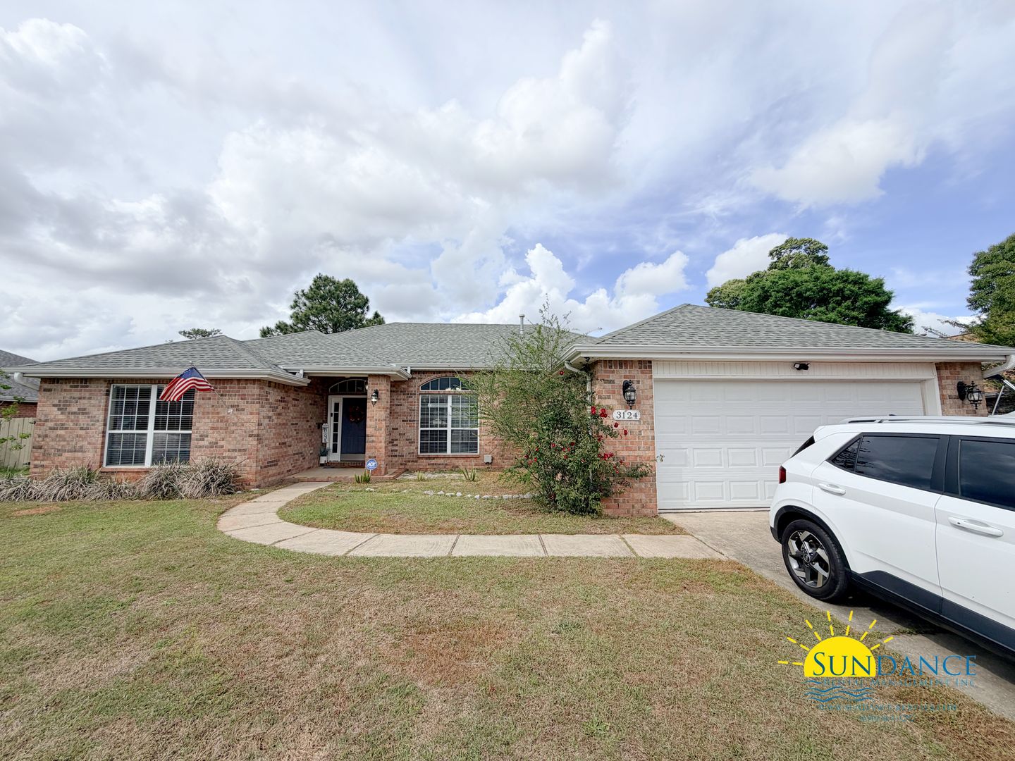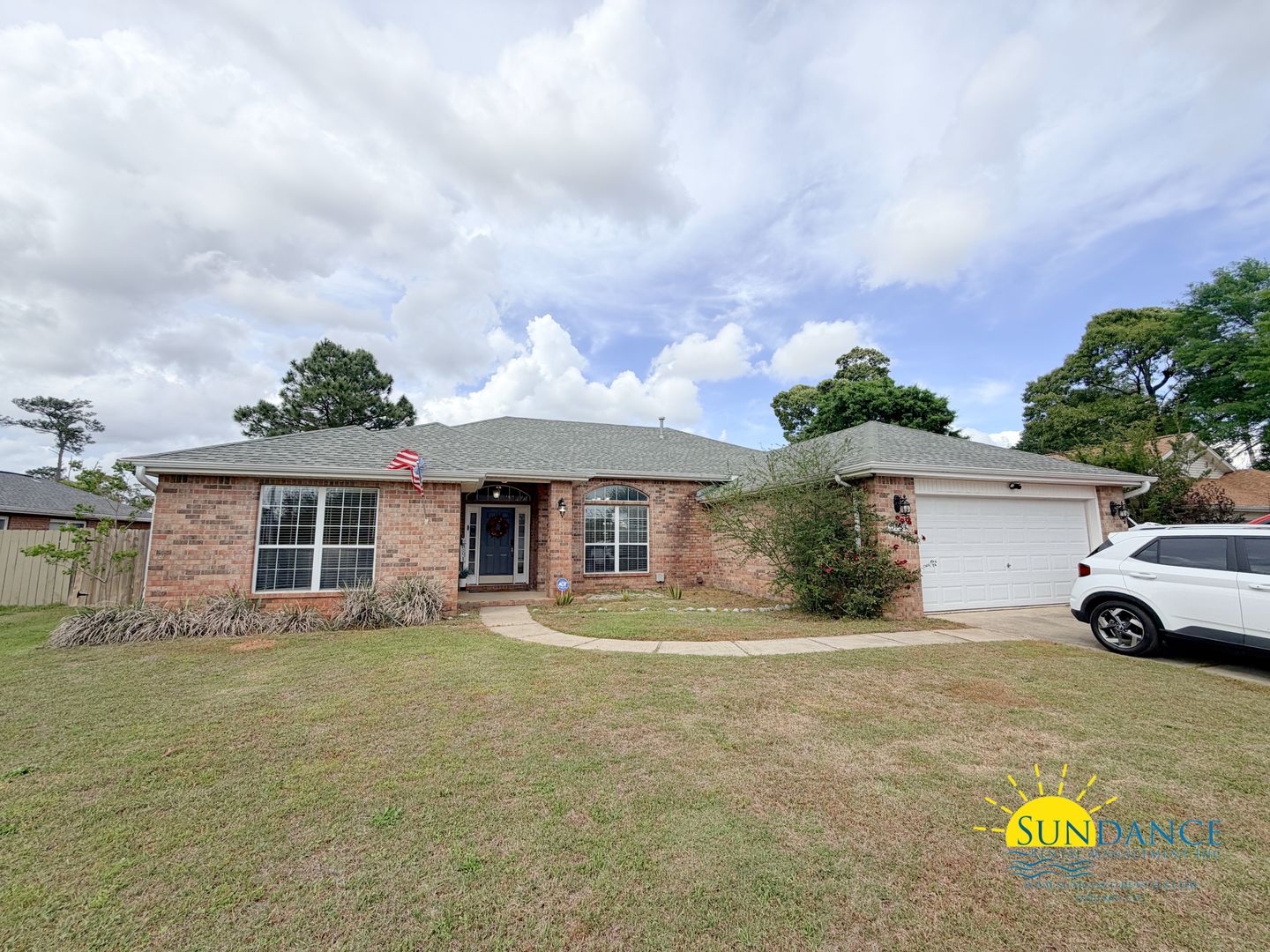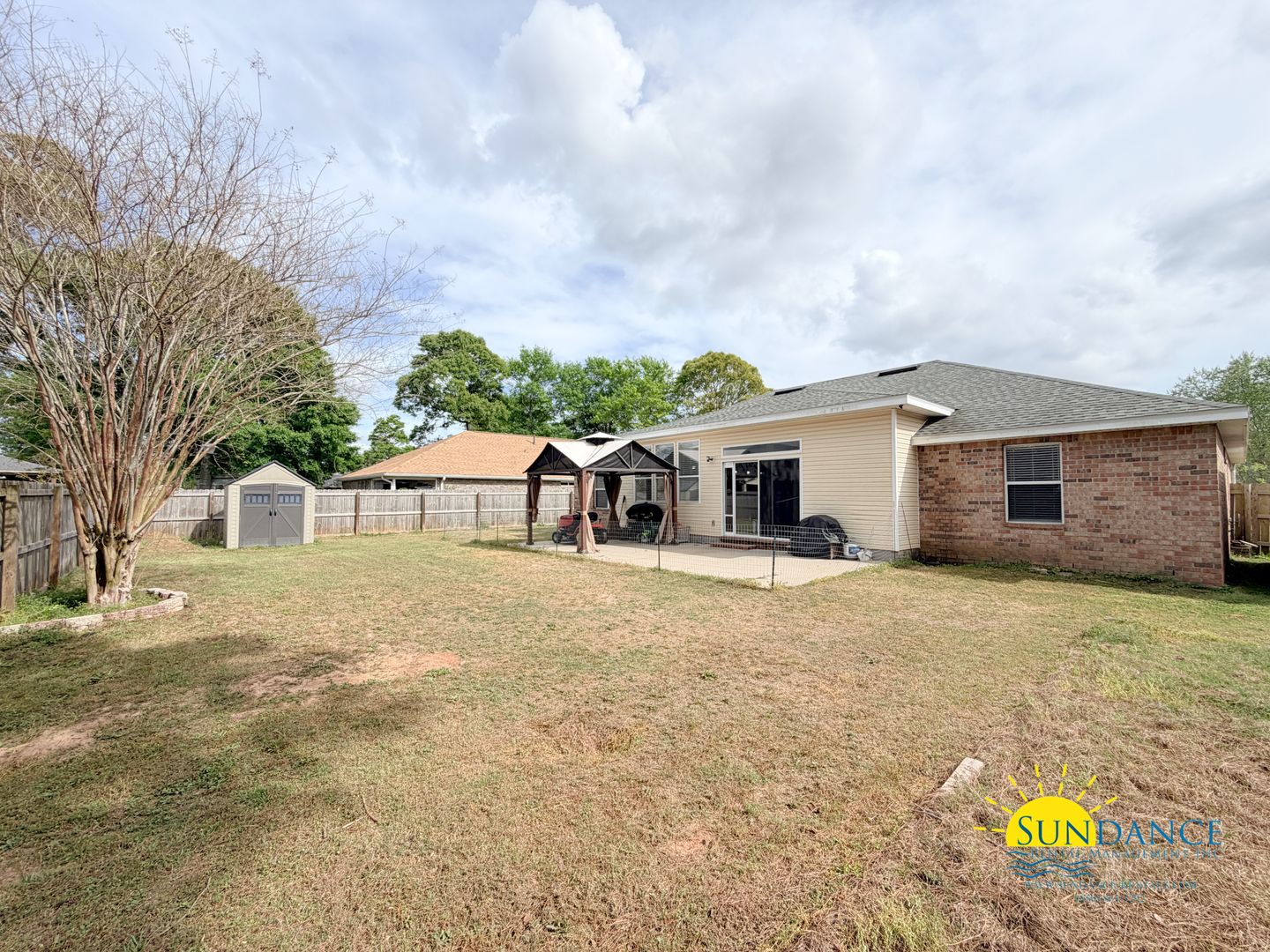 Located in the desirable Brooke Estates community in Crestview, this well-appointed 4-bedroom, 2-bathroom home offers both comfort and convenience, complete with a 2-car automatic garage and additional driveway parking. A thoughtfully designed split-bedroom floor plan provides added privacy, while the combined living and dining area welcomes you with durable vinyl flooring, abundant natural light from large windows, and an electric fireplace as-is for added charm. The spacious kitchen is both functional and stylish, featuring granite countertops, ample cabinetry, a breakfast bar, and a dedicated office nook. Appliances include a refrigerator, mounted microwave, dishwasher, and electric stove and oven. The primary suite serves as a relaxing retreat with a double vanity, garden tub, separate shower, and two walk-in closets. Three additional bedrooms are situated on the opposite side of the home and share a full bathroom, making the layout ideal for families or guests. Additional highlights include an in-home laundry room with washer and dryer provided, as well as ceiling fans throughout for enhanced comfort. Step outside to enjoy an open patio overlooking a fully fenced backyard perfect for outdoor living and entertaining plus a storage shed (AS-IS) for added convenience.