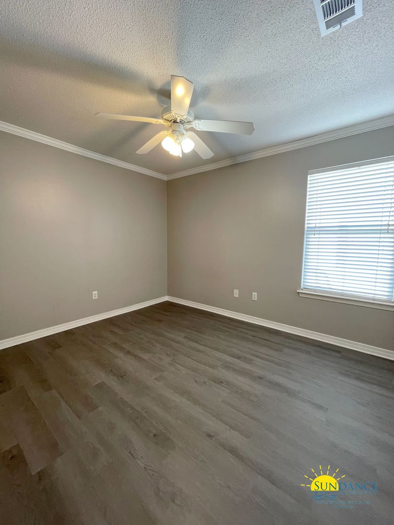 Located in Shalimar near Eglin Parkway, this 3-bedroom, 2-bathroom home offers convenient access to shopping, dining, and everyday essentials all while enjoying a peaceful setting with a community park directly behind the property and surrounding natural areas. The home features a split bedroom floor plan designed for added privacy and a spacious living and dining room combination filled with natural light. Durable vinyl flooring throughout enhances both style and ease of maintenance. The full kitchen includes stainless steel electric appliances such as a stove/oven, dishwasher, refrigerator, and mounted microwave, along with a breakfast bar and dedicated dining area, perfect for casual meals or entertaining. The primary suite offers a comfortable retreat with a walk-in closet, double vanity, and a shower/tub combination. Two additional well-sized bedrooms and a second full bathroom provide flexibility for family, guests, or a home office. Completing the interior is a laundry closet with washer and dryer hookups. Outside, enjoy the open patio and a fully fenced backyard featuring both wood and chain-link fencing ideal for outdoor relaxation or pets. A 2-car automatic garage with driveway parking adds convenience. Call Sundance today to schedule a showing and make this house your home!